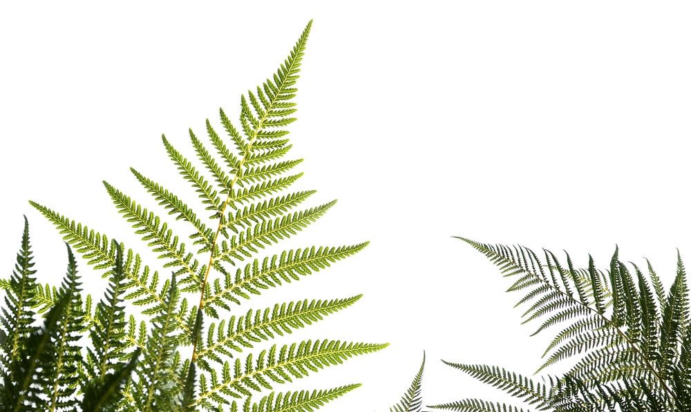 A horizontal, large image in a minimalistic style. The many green leaves of the fern at the borders of the picture create a beautiful pattern on the white background.
