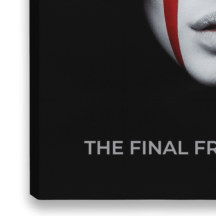 The work thrives on radical reduction. The black negative space dominates the surface and directs the gaze uncompromisingly towards the half-visible face. The almost monochrome design in shades of white, grey and black is accentuated by an intense red, which creates tension as a visual axis. This vertical line not only divides the face but structures the entire visual impact of the image. Light, shadow and framing are arranged in such a way that both proximity and distance are created simultaneously. The typography at the bottom of the image reinforces the character of an iconic, cinematic art poster.