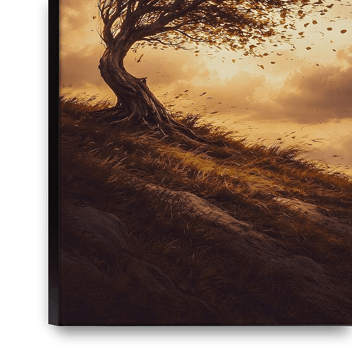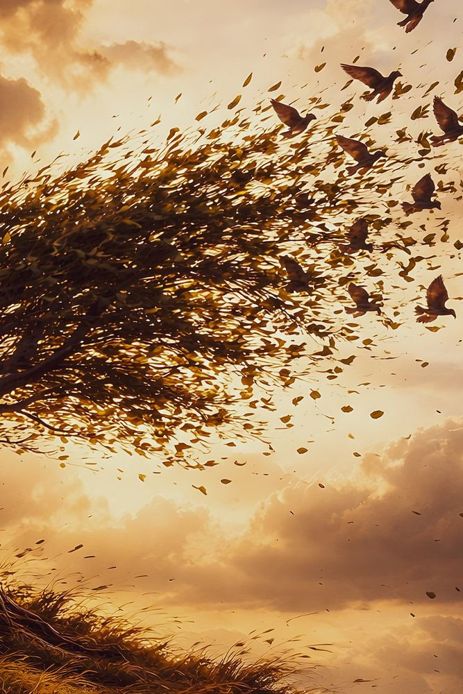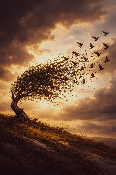 In this powerful image, we see a solitary tree, deeply rooted on a hill, bent under the force of the wind. Its trunk leans, its crown is swept away, but it remains standing. What makes this work truly special is the moment of transformation: the leaves that fall off turn into birds halfway through their flight. What begins as loss ends…