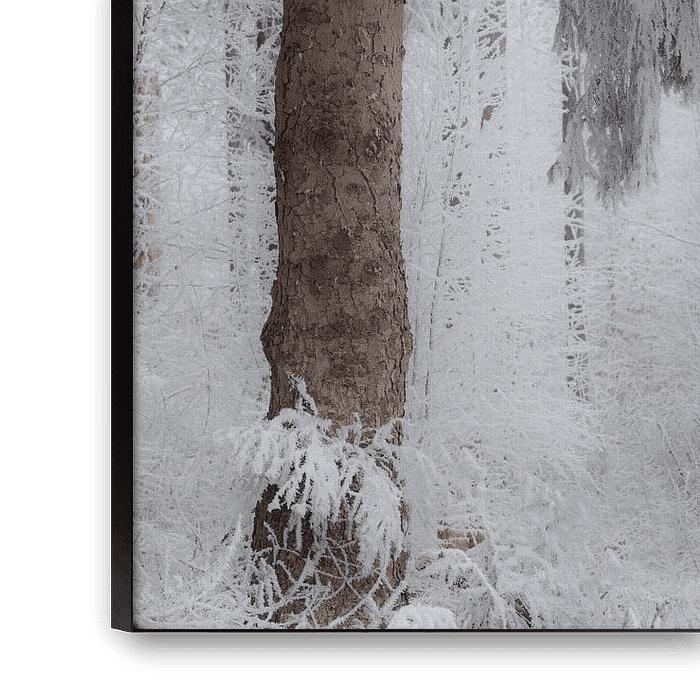 The fairytale picture of the forest near Dwingeloo in the national park Dwingelderveld, Drenthe. A thick layer of snow lies on the branches of the trees and fog hangs in the forest. A beautiful landscape photo with a mystical atmosphere