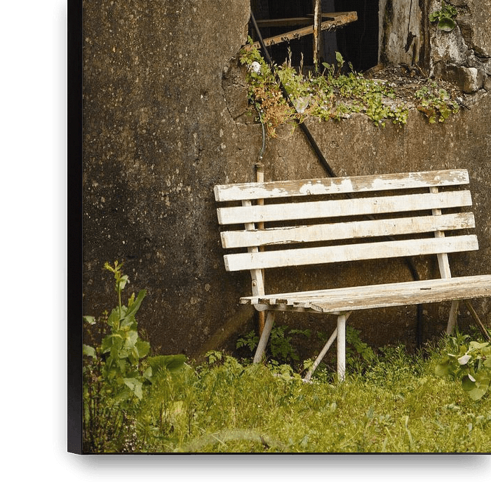 Old garden bench with white foliage paint under a dilapidated window with a rough wall where you can see some of the bricks in a forgotten garden in Kinsale County Cork Ireland.