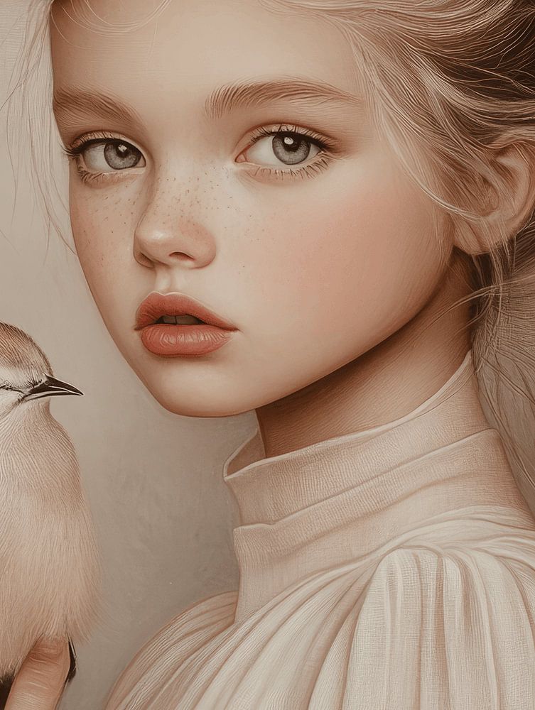 This work conveys a timeless sense of elegance and sophistication. A young girl wearing a large, delicate bow and a cute little bird on her hand creates a dreamy, nostalgic mood. It looks like an artwork taken directly from a classic fashion illustration, but with a soft, modern twist. The details of the girl's face and the use of pastel shades give the image a warm and romantic feel, as if we are glimpsing a fairytale world.