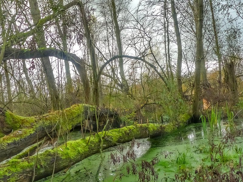 floats away. A moss-covered forest, swampy pools roofed with fallen trees
