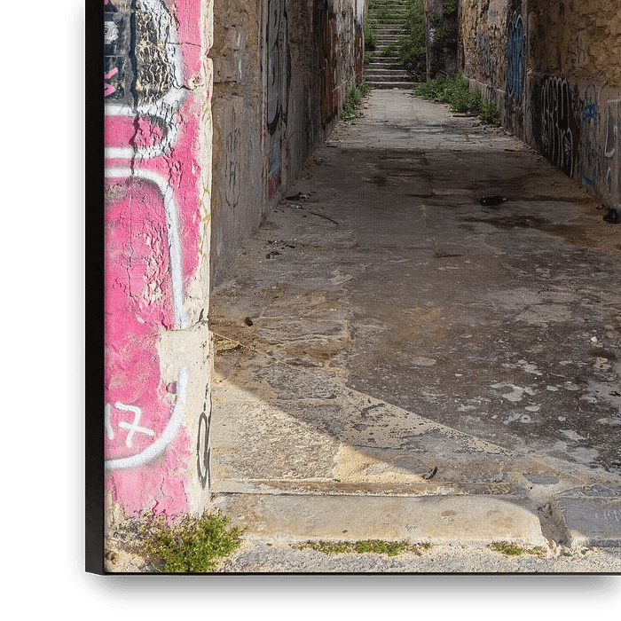 Door and passage in a state of decay and embellished with graffiti along a quay on the Tagus River in Lisbon's Almada district.