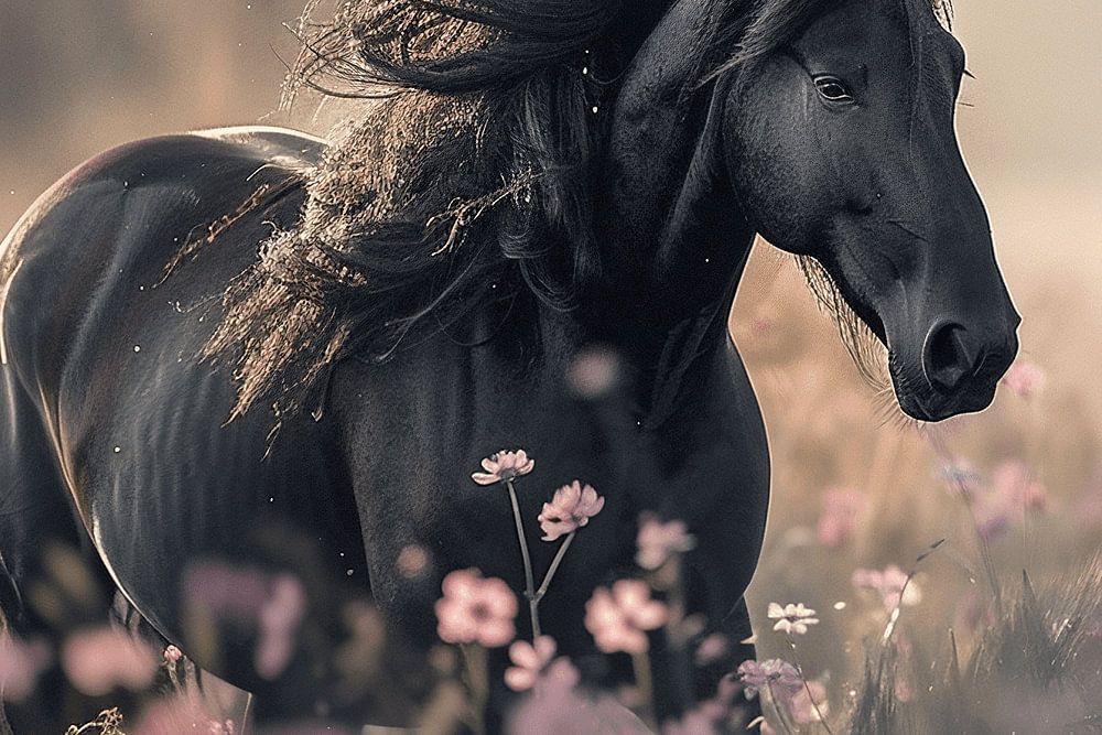 A picturesque scene is revealed through the lens: a majestic horse standing amid a sea of flowers. Its coat, a mix of powerful black and shimmering brown, stands out against the vibrant colours of the flora. The flowers stretch out in a colourful patchwork of red, yellow, blue and purple, each petal telling its own story. The sun casts warm rays on the scene, making the colours even more vivid and making the whole scene seem drenched in a golden glow. The horse, elegant and powerful, gallops among the flowers with grace, its mane flapping in the wind as it sniffs the scent of spring. The image exudes a sense of freedom, beauty and harmony, a moment of pure serenity amidst nature.