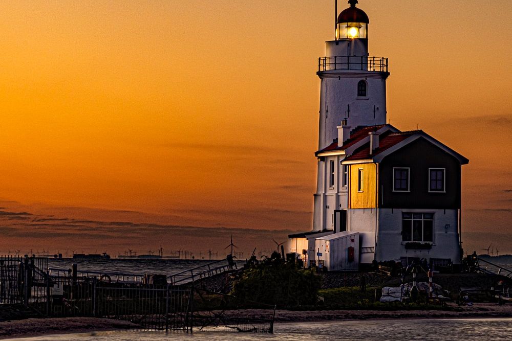 The Marken Lighthouse, popularly known as the Horse of Marken, was designed by Jan Valk and built in 1839 and stands on the eastern tip of the island of Marken. The lighthouse has a light height of 16 meters and a light range of 9 nautical miles. The light keeper's house next to the tower is occupied. The buildings have been a national monument since 1970. The first tower on Marken was built in 1700 and was square. It was one of three lighthouses near Marken, De Ven and Hoek van 't IJ which were decided upon in 1699 to mark the route from the Wadden Sea to Amsterdam. The towers were equipped with oil lamps designed by Jan van der Heyden.