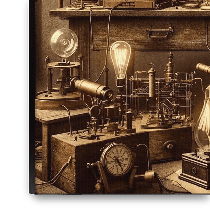 Buy this digital art artwork The inventive spirit of Thomas Edison: A genius surrounded by creativity by artefacti as a reproduction on canvas, ArtFrame, poster and wallpaper, printed on demand in high quality.