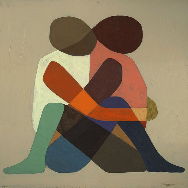 In the artwork, two abstract human figures form a new form through their embrace together. The work is composed of several layers of colour, which provide depth and structure. Each component has its own mood, shape, and geometric relationship to each other. Two components are filled with small vertical dashes, a reference to time, which…