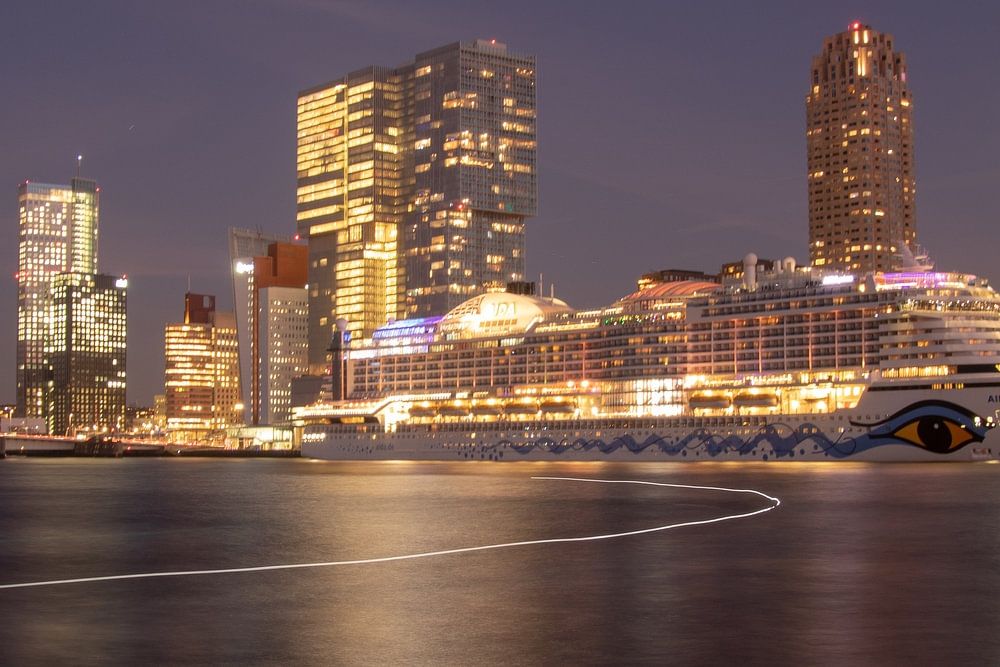 Photo of the Kop van Zuid with the Erasmusbrug, the cruise ship Aidaprima, De Rotterdam.