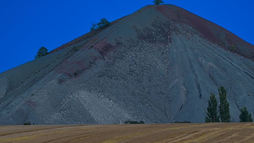 The moon above the winding tower at the spoil tip at the blue hour