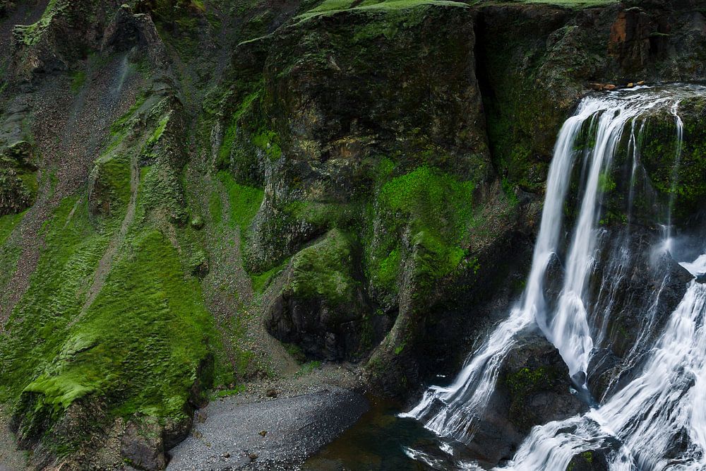 The Fagrifoss waterfall is located in a hilly green landscape characterized by dark rock and green mosses.