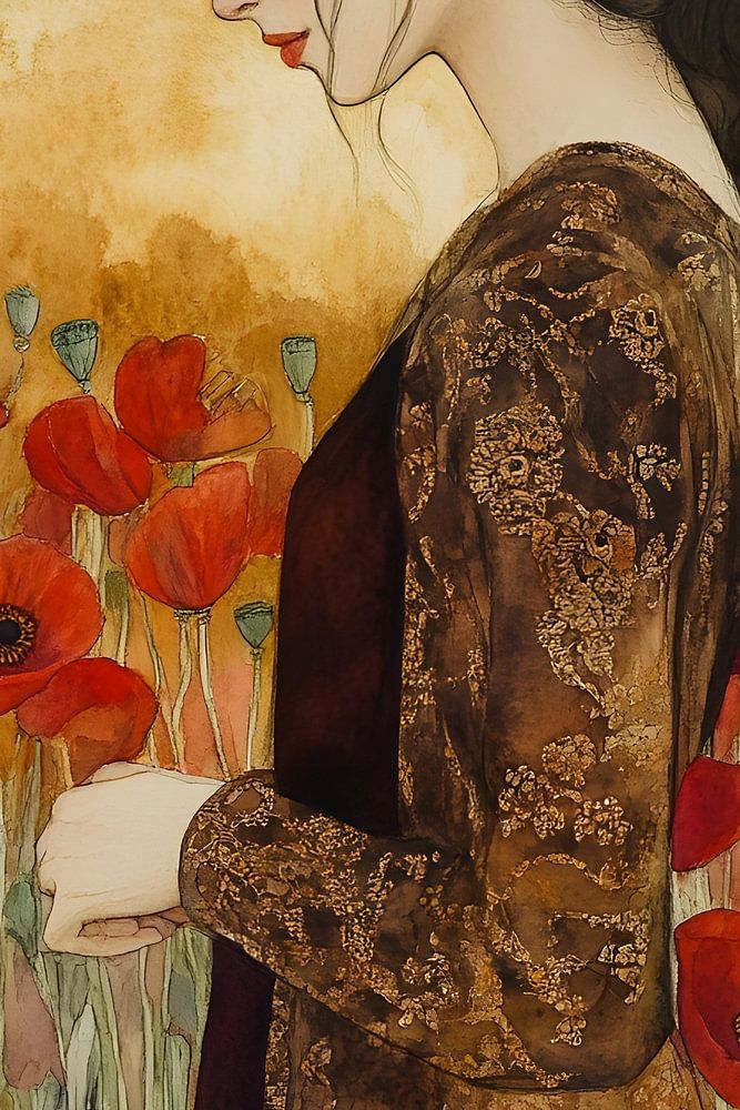 Her dress is decorated with golden and floral patterns reminiscent of Klimt's iconic ornamentation. These patterns seem to interweave with the poppies and reinforce the connection between the woman and nature. Her face radiates calm and grace as she closes her eyes, as if she is lost in thought or absorbing the beauty of her surroundings.