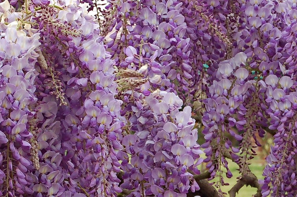 This magnificent wisteria displays its clusters of pale purple flowers in full bloom. These long, pendulous clusters create a cascade of delicate colours, adding an elegant, poetic touch to any garden or landscape.