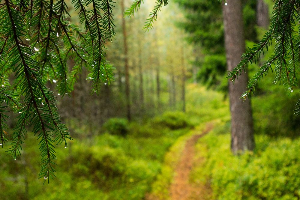Forest path in Norway in the rain. Around the path, blueberries and pine trees grow and, despite the bad weather, there is something soothing about it.