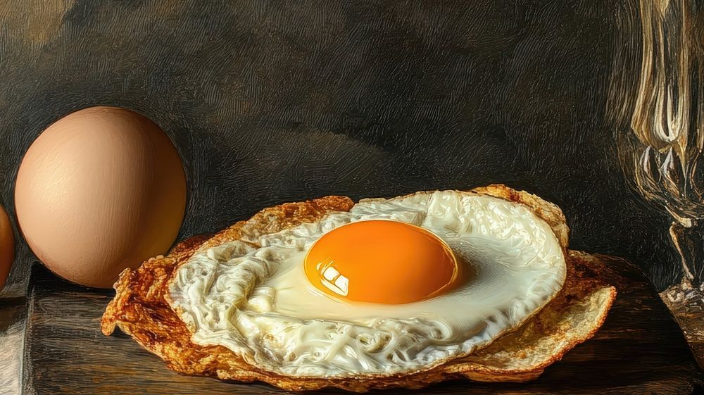 This still life presents a perfectly fried egg, whose bright yellow yolk is at the centre of the arrangement and attracts the viewer's attention. The contrast between the shiny yolk and the slightly crispy edge of the egg white lends the picture a subtle dynamic. To the left, two intact eggs rest, their soft curves and matt surfaces contrasting with the shiny texture of the cooked egg. A broken eggshell at the lower edge of the picture hints at the process of creation, as if the moment of frying has only just passed.