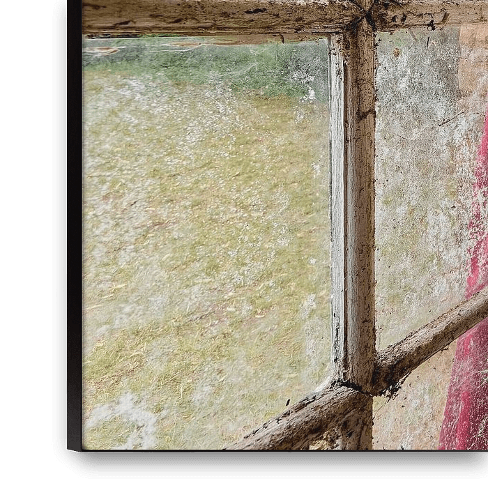 What is striking is the beautiful light falling through the window frame onto the torn fabric of the lampshade. The window glass is opaque...from tarnish and cobwebs. The wood is charred and rotten, but barely holds the glass in…