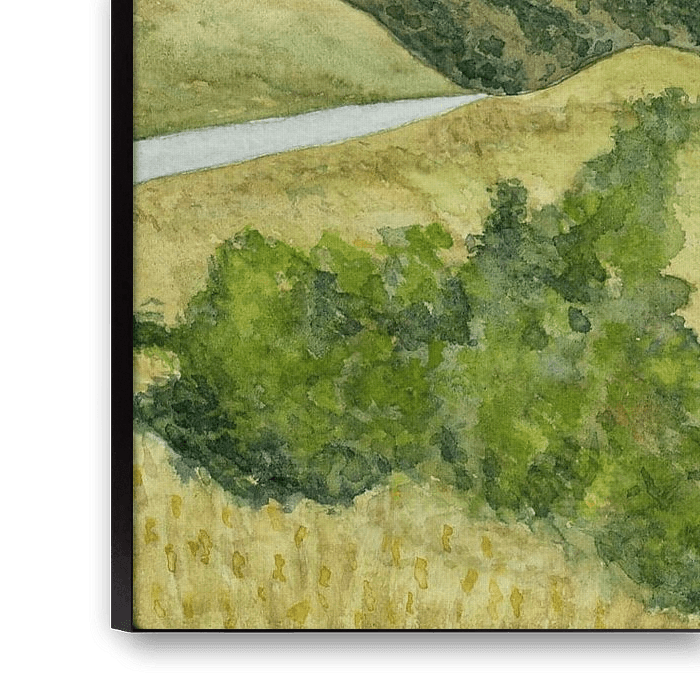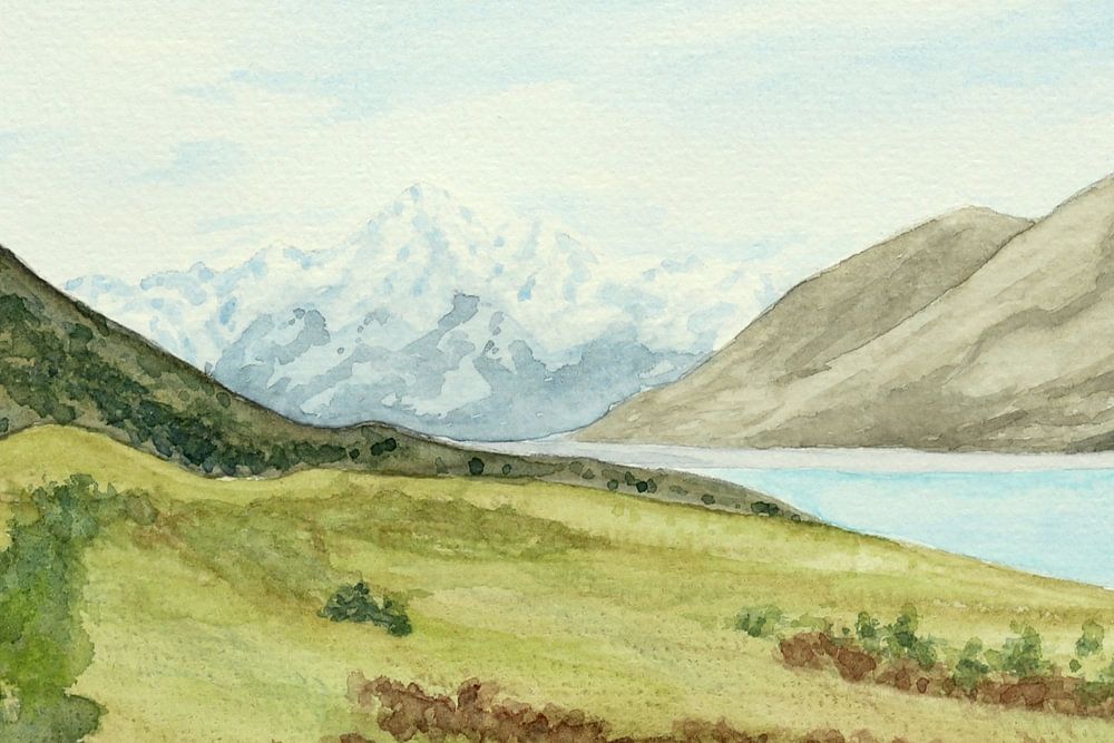 This painting was created in response to a photograph I took while travelling through New Zealand. This dead-end road of up to 65 km long takes you to the foot of New - Zealand's highest mountain. Mount Cook, named after the English explorer James Cook, lies in the National Park of the same name and is 3764m high. It is called 'Aoraki' by the Maori, meaning cloud piercer. I made the painting with watercolours. Real handwork in other words! The original is 30 x 40 cm, but the nice thing about a print is that you can choose any size and material you want. The painting has been photographed in such a way that the structure of the watercolour paper is still clearly visible. This has the advantage that it looks even more like a real painting, even though it is a print. Curious about what else I have painted? In my shop, I have many different types of landscapes, among others. From summer representations to winter and from abstract to more detailed artworks. They can be found in the 'landscapes and street scenes' folder. I used the following colours: blue, green, red, grey and brown.