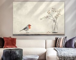 Discover the serene beauty of 'The robin and blossom' an artwork that perfectly captures the essence of wabi-sabi and Japandi design. This piece depicts a delicate bird sitting gracefully on a table, against a soft, muted background that evokes a sense of calm and contemplation. Perfect for lovers of the understated elegance of nature and the beauty found in simplicity and imperfection. This piece brings a calm, contemplative atmosphere to any space, inviting one to find peace in stillness and celebrate life's quiet moments."