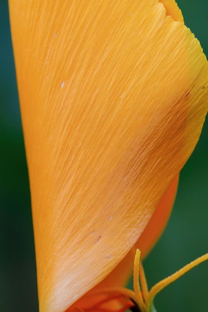 The Californian poppy impresses with its orange nuances and enchantingly structured petals. In this picture, we see the last petal, whose shape is reminiscent of a sail, ready to set off on its journey into the world. The exposed filigree pistil is reminiscent of a sailor keeping his boat on course.