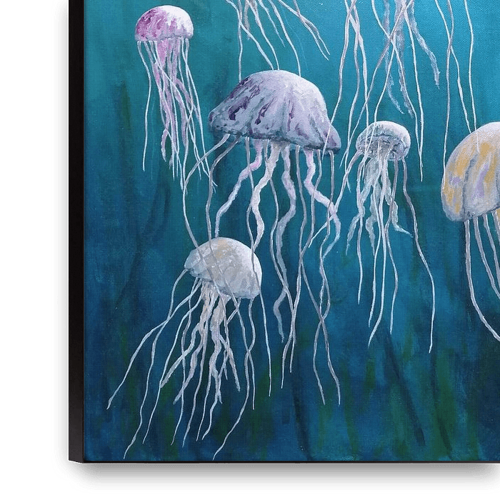 This acrylic painting shows the tranquillity that floating jellyfish radiate under water as they are illuminated by the light from the surface. A calming and meditative motif.