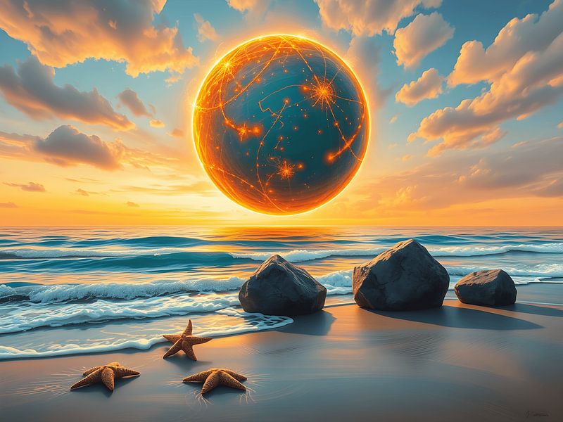 Dit surrealistische kunstwerk ontvouwt zich als een droom die zich langzaam laat begrijpen. Boven een kalme zee zweeft een vurige bol, losgemaakt van zwaartekracht en logica. Het is geen zon, geen planeet, maar een innerlijk licht: een visueel ankerpunt dat het landschap overstijgt en de kijker uitnodigt tot…