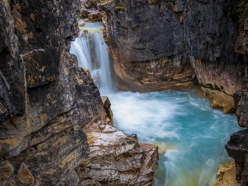 The photograph depicts a powerful, blue stream of water flowing through a narrow gorge of rock formations. A waterfall cascades down from the top left into a bowl-shaped basin, where the water swirls before continuing on its way. The rocks are jagged, dark grey to beige in colour, and show signs of erosion.