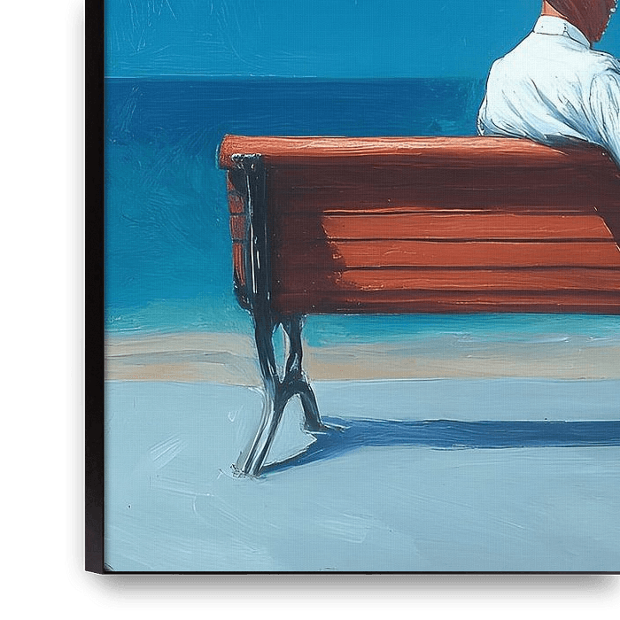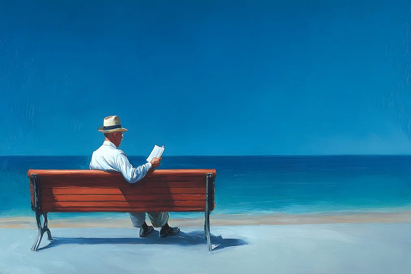A single man sits on a wooden bench on the beach, his back turned to the viewer. He reads a book while gazing out over the calm, deep blue sea. The sky and water form large, clear areas of colour; the beach is almost deserted. The scene is simply composed, with plenty of open space and a clear horizon line.