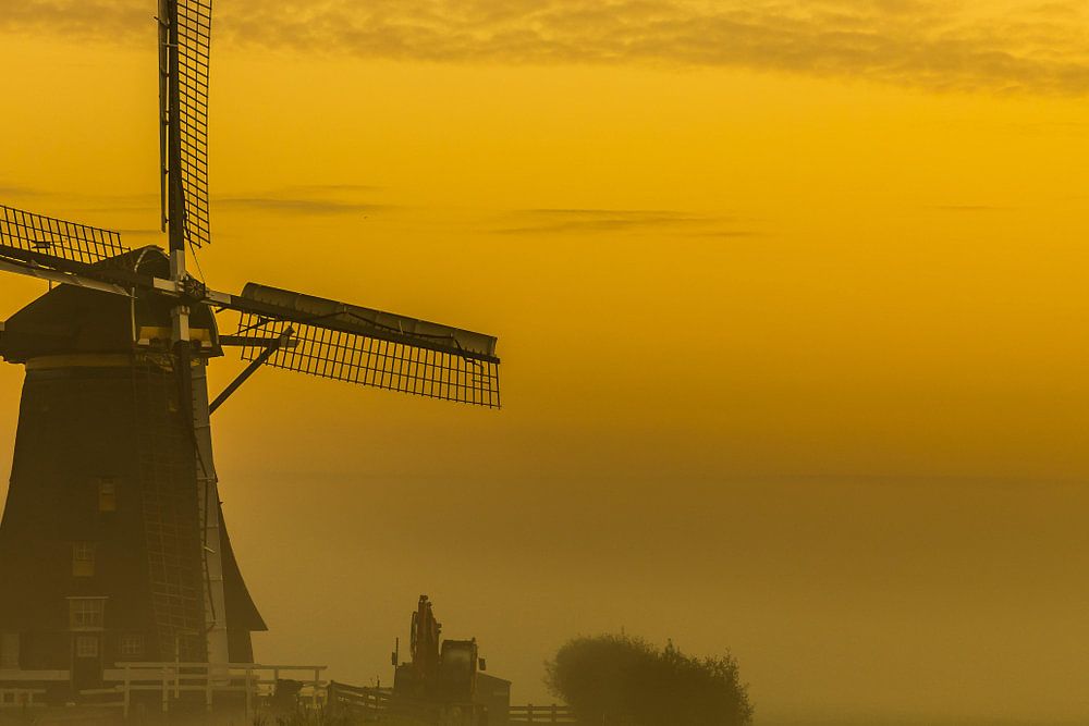 Sunrise at the Molenviergang in Aarlanderveen/Alphen aan de Rijn in Het Groene Hart. A cold morning with low hanging fog. The lines of the water and the path draw the viewer straight to the restored mill.