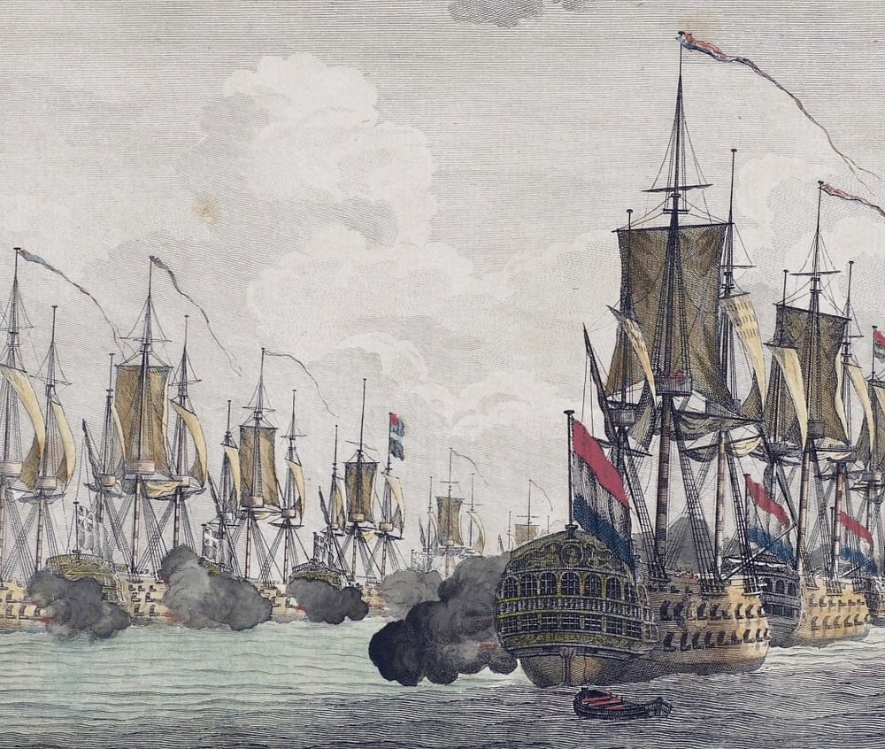 Naval battle, occurred on Doggersbank, in the Ogtent of the 5th August 1781, between the Dutch Fleet. The Dutch and English ships in line at the start of the naval battle at Doggersbank on 5 August 1781 between the Dutch fleet under Rear Admiral Johan Zoutman and the English fleet under Vice-Admiral Hyde Parker. In the margin the title and dedication in Dutch and in the centre Zoutman's coat of arms. Part of a pair. etching and engraving, hand-coloured Cornelis Bogerts (Velsen-Zuid 1745 - Amsterdam 1817) was a plate cutter, draughtsman, engraver (printmaker), etcher and lithographer in Amsterdam and pupil of Jan Punt.