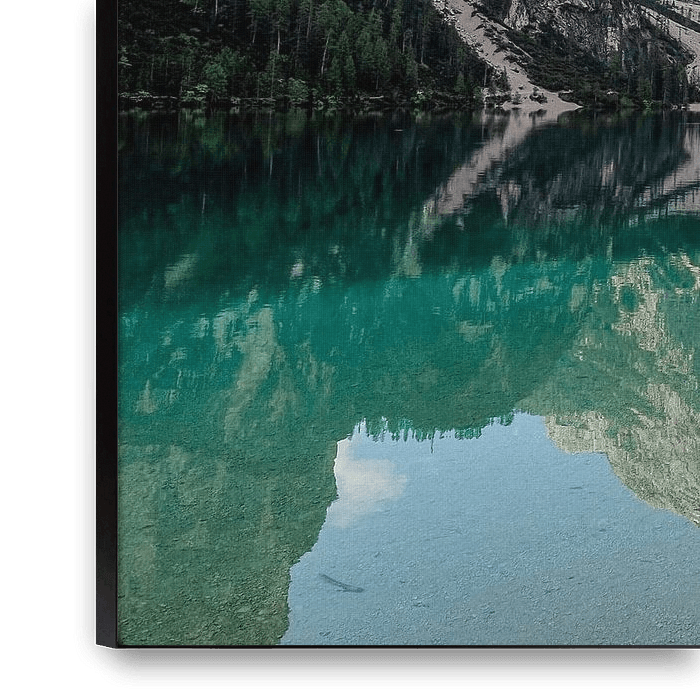 Buy the photo The turquoise-coloured Lago di Braies is nestled quietly between the steep rock faces of the Dolomites. Mirror-smooth water by Miriam Schwarzfischer Fotografie on canvas, ArtFrame, poster and wallpaper, printed on demand in high quality.