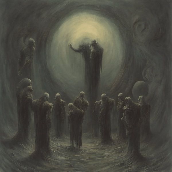 Andreas Manfred Gebhards "Das Opfer" ist ein packendes, tiefgründiges Kunstwerk, das durch seine düstere Atmosphäre und seine suggestiven Bilder fesselt. Das Bild ist in einem monochromatischen Farbschema mit einem dominierenden Grauton gehalten, das nur durch den schwach leuchtenden gelben Kreis im Hintergrund durchbrochen wird. Die…
