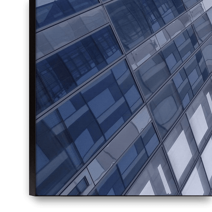 Modern buildings with glass façades are often worth looking upwards! When photographed with a wide-angle lens, as here, the buildings almost seem to touch each other. The reflective glass surfaces result in almost textureless areas in fine colour gradations, which is why the whole picture is reduced to geometric figures. The overall…
