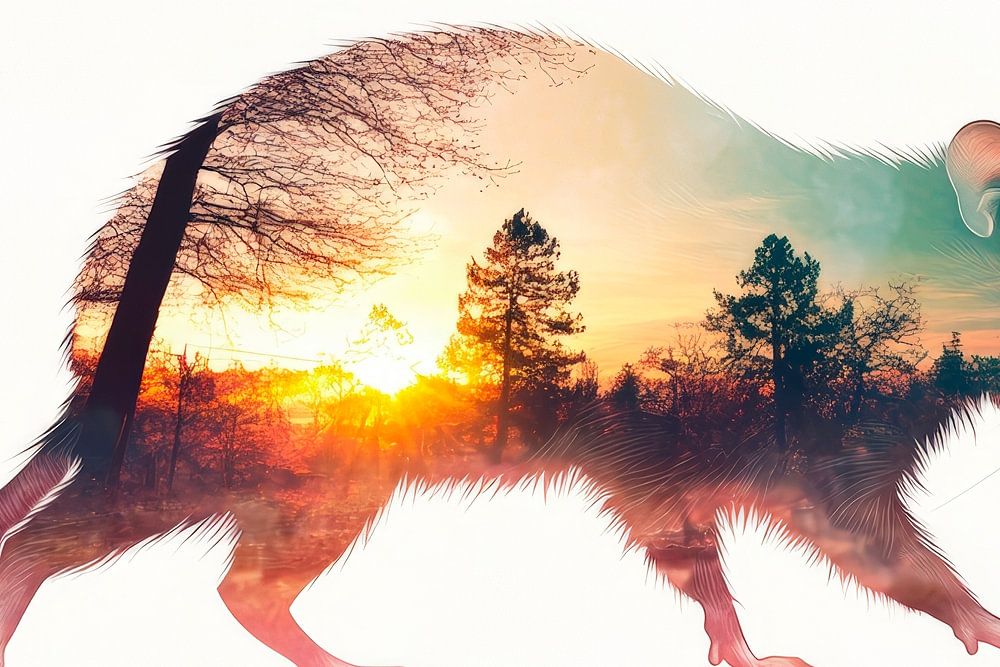 A harmonious interplay of nature and wildlife unfolds in this artistic depiction, where the silhouette of a mouse merges with the gentle splendour of a sunset and a dense forest. This fascinating picture brings a touch of magic into the living room and invites you to dream.