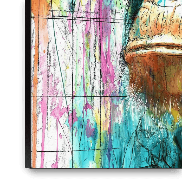 "Wise Monkey" is a powerful illustration showing a monkey with an intense, thoughtful expression. The monkey is depicted wearing glasses, and its face is detailed in vibrant colours such as blue, orange, green and pink. The combination of sharp lines and colourful spots brings the figure to life, and his piercing gaze exudes…