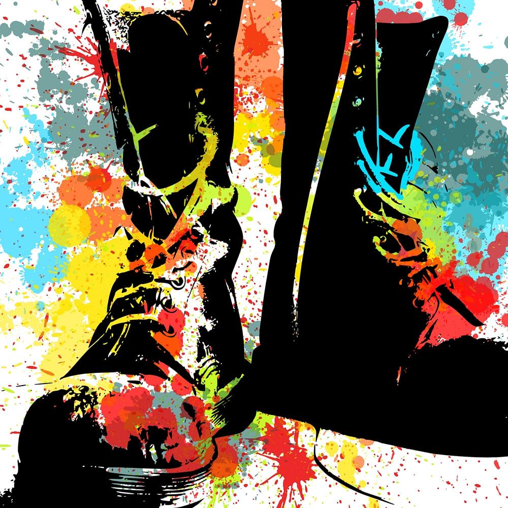 Modern art: black boots (as I have worn many pairs in my life) combined with rebellious paint splatters.