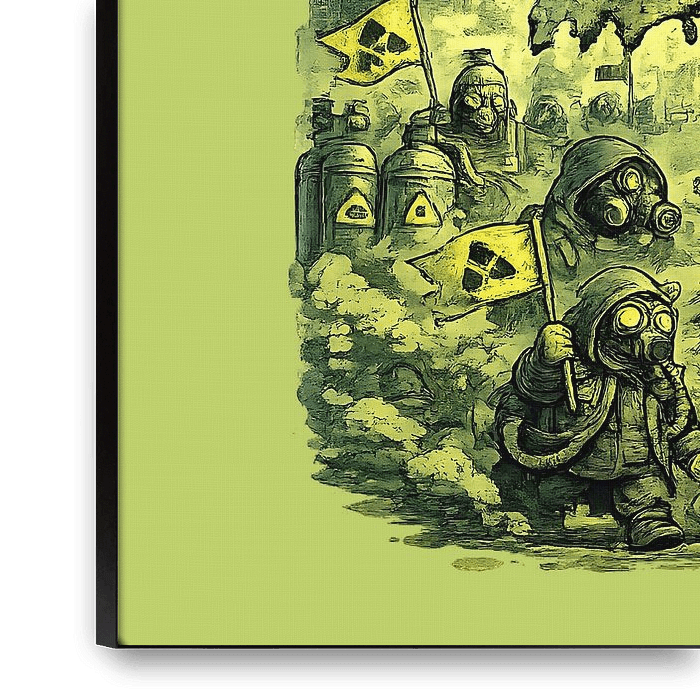 Marching figures and muted danger suggest tradition overpowering awareness.