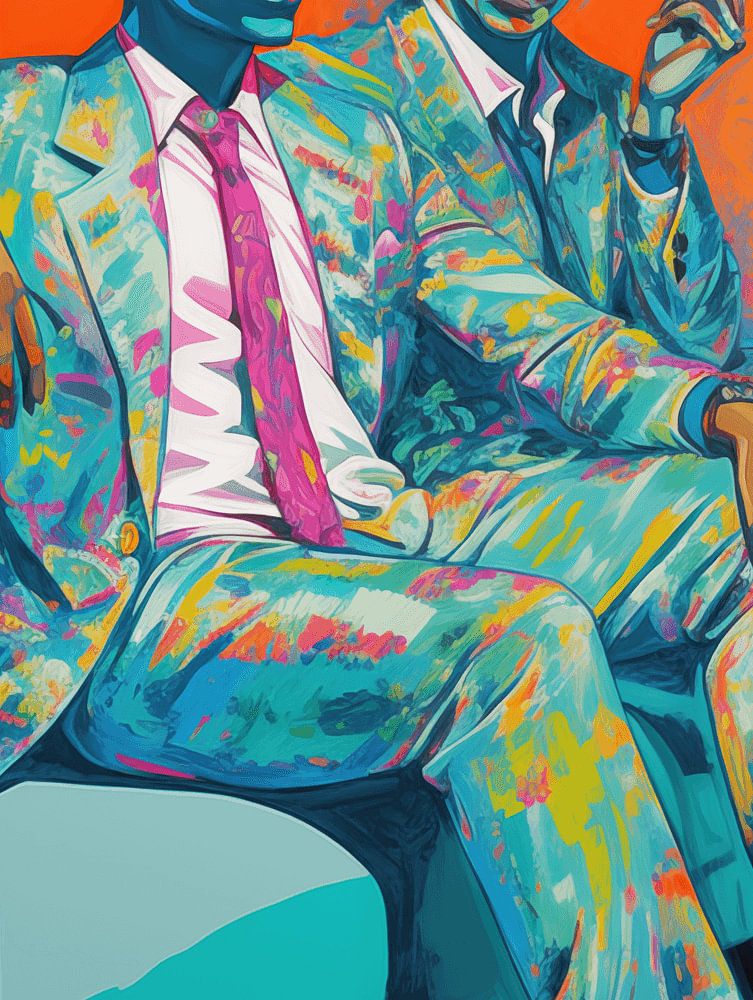 This expressive painting captures a moment of reflection and unspoken thoughts, in which the power of silence is palpable. Two stylish gentlemen, dressed in vibrant suits with abstract patterns, sit relaxed on a retro-inspired sofa. Their bodies rest in a nonchalant pose, their gazes focused on something in the distance-as if sunk in their own thoughts, without the need for words.