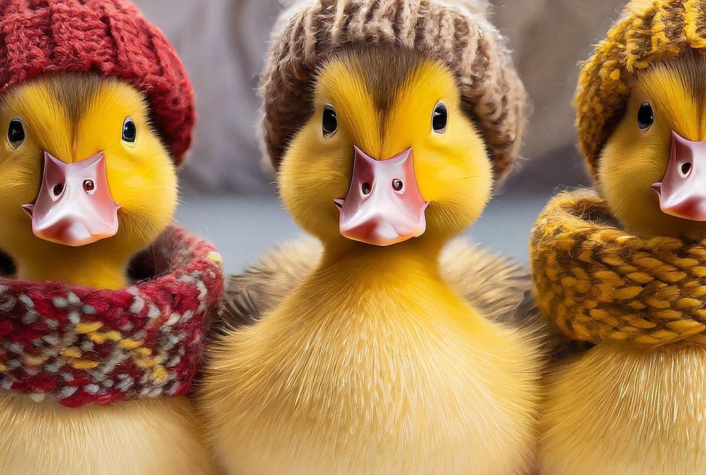 Three ducklings are prepared for the cold winter, with their knitted woollen hats and knitted woollen scarves. The image was generated using ai.