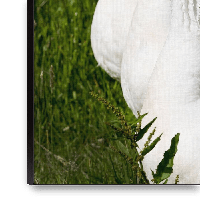 Three white geese with orange beaks in a row in the green grass. Not photoshopped, pure nature, a special moment.