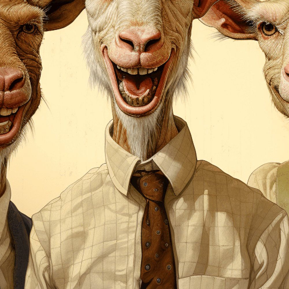 This humorous yet masterful portrait shows three anthropomorphic billy goats in classic business attire. The goat heads are depicted hyper-realistically with meticulous attention to detail in the hair and beards. All three smile exuberantly and show their teeth in a comically heartfelt manner. They wear suits and shirts with ties, with patterns and cuts reminiscent of the mid-20th century. The lighting is warm and soft, emphasising the nostalgic and familiar atmosphere of a traditional group photo. The image is a successful example of whimsical realism and plays with human conventions in a humorous way.