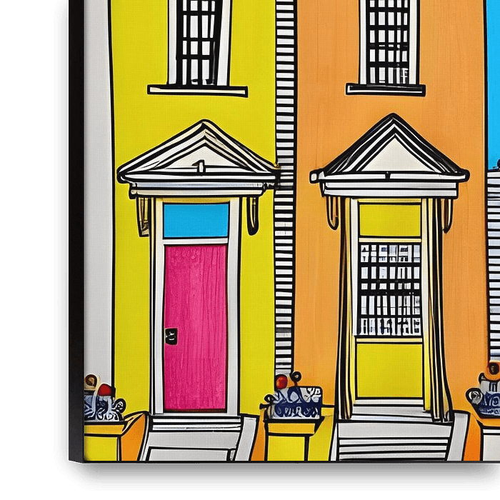 Colourful prints, abstract, figurative illustrations depicting houses, canal houses from various countries and cities.
