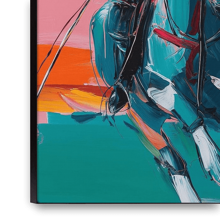 Three polo players galloping powerfully. Expressive brushstrokes and bright areas of colour lend the scene dynamism, excitement and contemporary intensity.