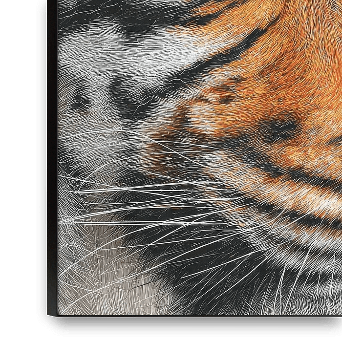 This stunning close-up shows the right side of a tiger face in impressive detail, with the texture of each hair carefully worked out. The fiery orange eye is the shining centrepiece, reflecting a subtle setting, adding an almost mystical dimension to the work. The vibrant shades of orange, black and white contrast powerfully against the…
