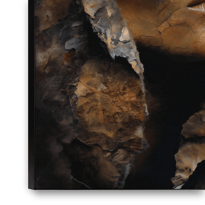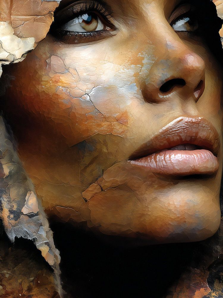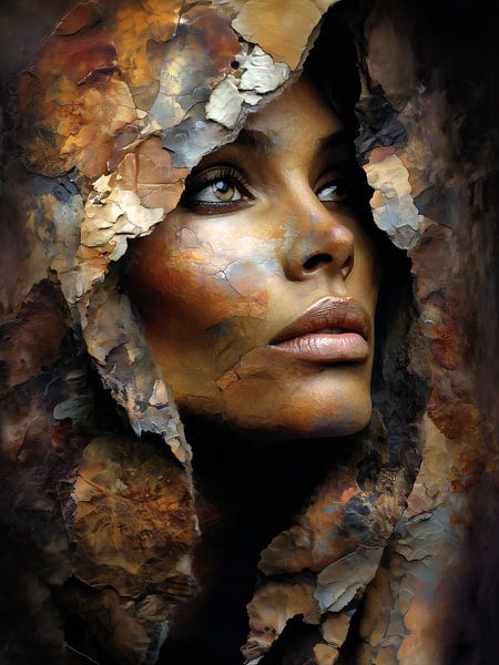 Abstract portrait of a woman in earth tones, featuring a coarse paint and stone texture.