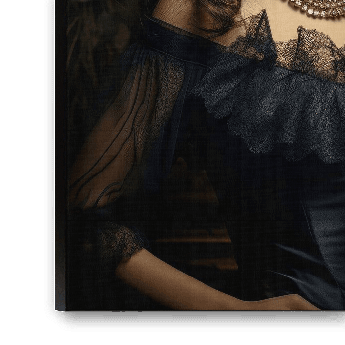 This portrait radiates timeless elegance and classic beauty. The young woman is at the centre of the composition, dressed in a stunning black lace dress that exposes her shoulders and is adorned with delicate ruffles. The plunging neckline of the dress and the delicate lace lend her appearance a sensual yet sophisticated touch. A multi-strand pearl necklace adorns her neck and emphasises the noble character of the image.