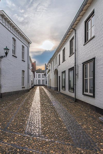 A characteristic street with white gables and an authentic cobblestone road, bathed in soft daylight in the white town of Thorn.