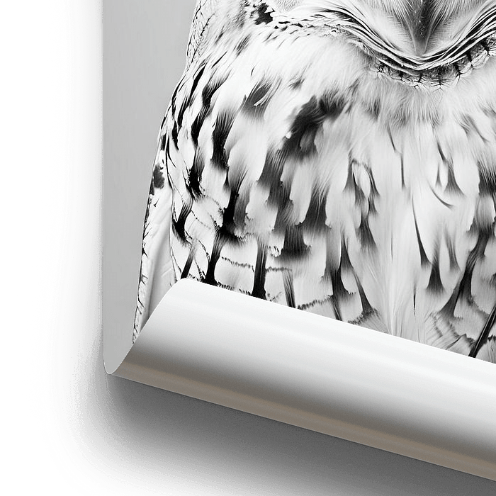 This image shows a detailed close-up of an owl in black and white. The texture of its plumage and the expressive eyes are fascinating.