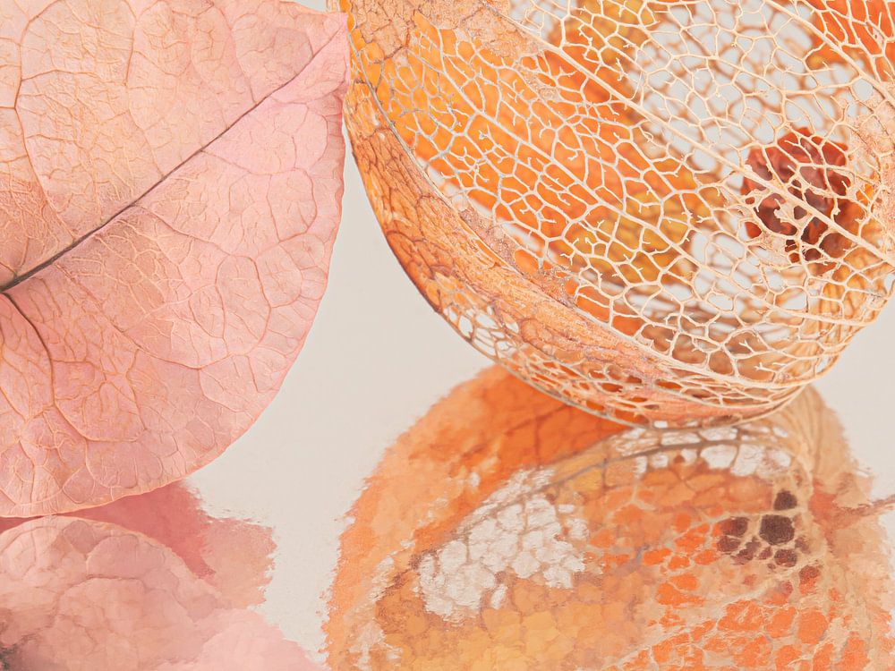"Together: So different but well-fitting" is a picture of a still life of lantern and a dried leaf. It looks as if these two belong together, they radiate something sweet together. The lantern is already almost decayed, so you can really see the beautiful grain structure. At the back of the lantern, you can still see bits of orange from the skin of the lantern. The leaf (or actually a set of leaves) has been dried by the sun and this also allows you to see the vein structure, again a completely different vein structure to the lantern. The leaf is light pink with something orange in it.