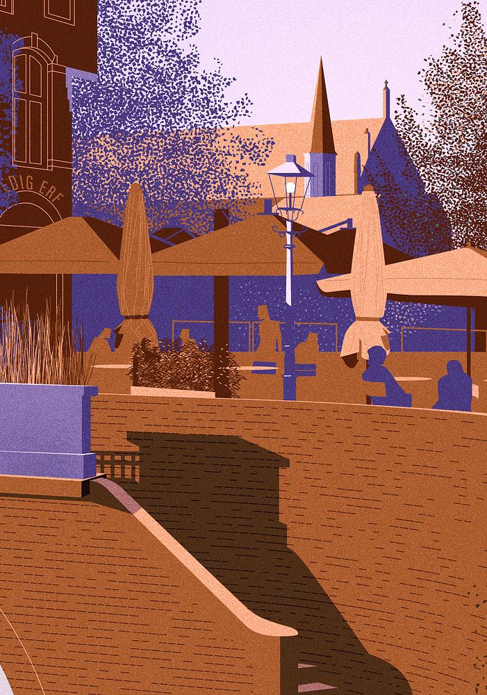 Illustration of the Tolsteeg barrier and Ledig Erf in the center of Utrecht.