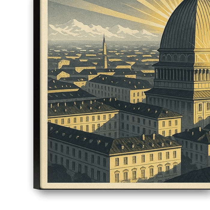 This Torino Art Deco poster highlights the striking Mole Antonelliana set against the dramatic backdrop of the Italian Alps. Rendered in muted gold and grey tones, the design blends elegance and strength, reflecting Turin’s cultural and architectural significance. Radiant beams of light emphasize the city’s historic skyline, while the surrounding mountains symbolize grandeur and stability. Inspired by classic European travel posters, this piece combines geometric Art Deco styling with timeless Italian charm. Perfect for adding sophistication to any wall, it captures the spirit of Turin as a city of history, innovation, and design. Ideal for display in a living room, study, or creative workspace, it evokes both nostalgia and inspiration. This Torino wall art is also a wonderful gift for travelers, art enthusiasts, or anyone with a passion for Italy’s northern cities. With its balance of boldness and elegance, it makes a lasting statement piece.
